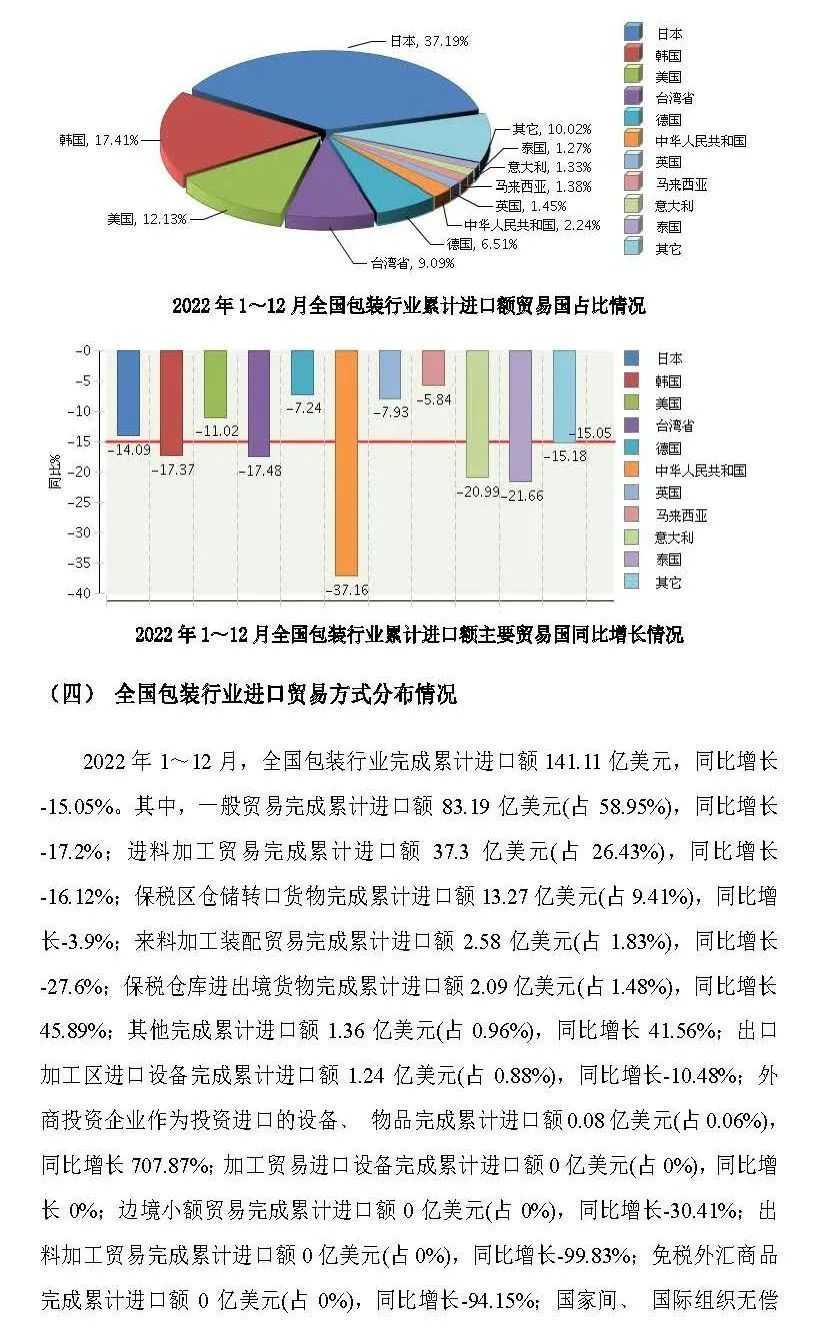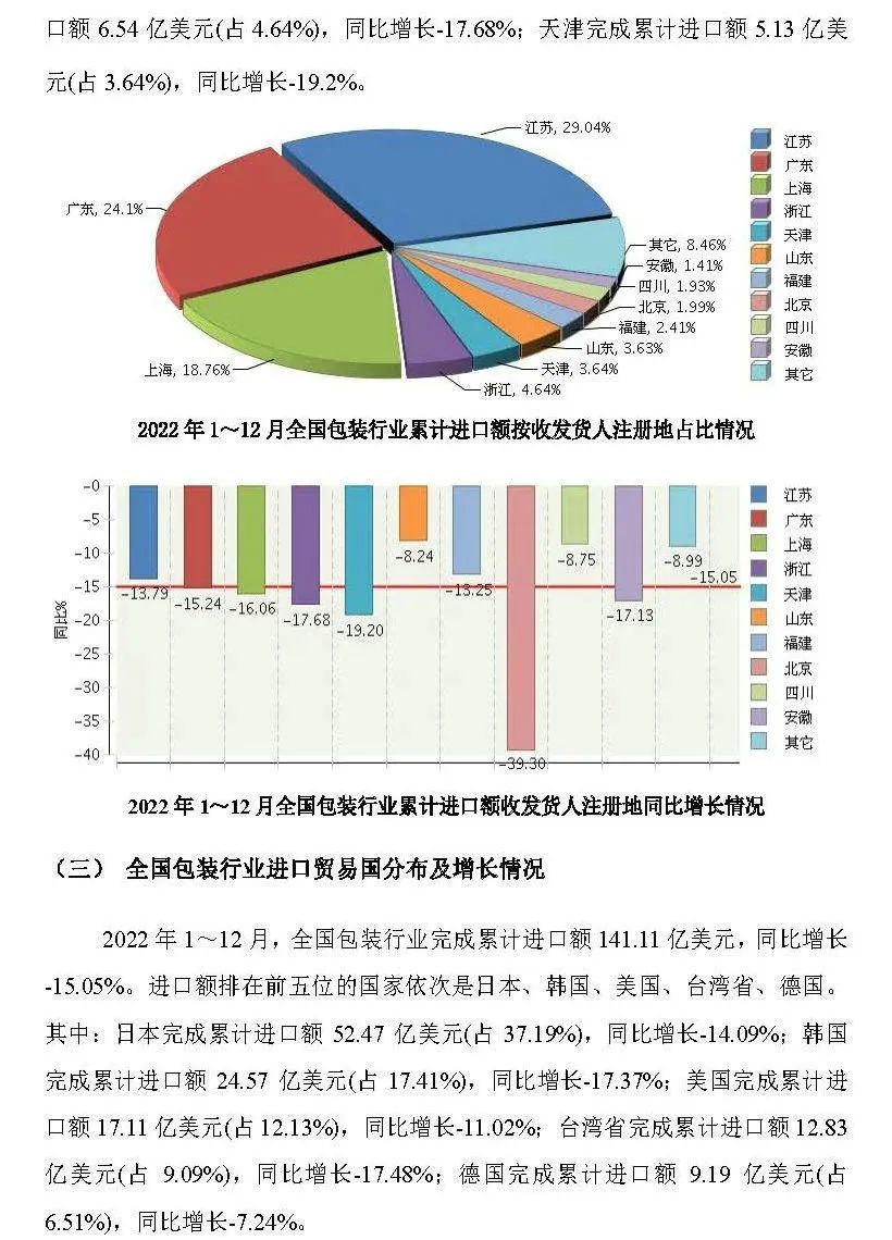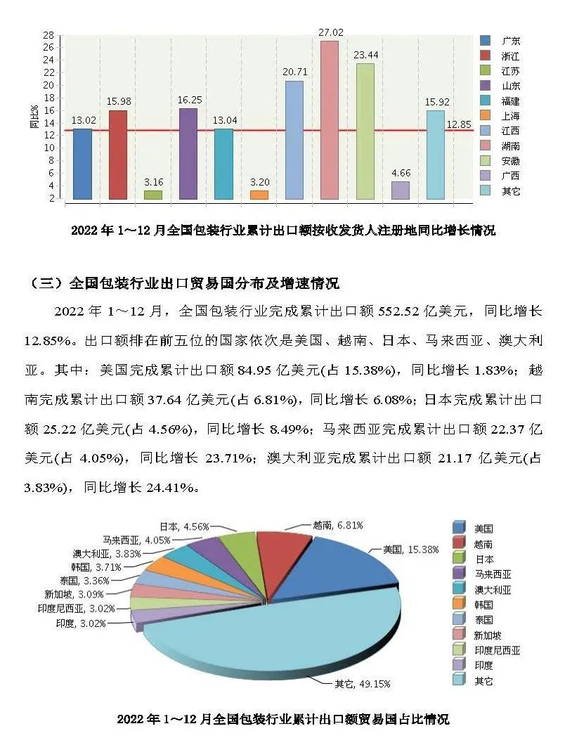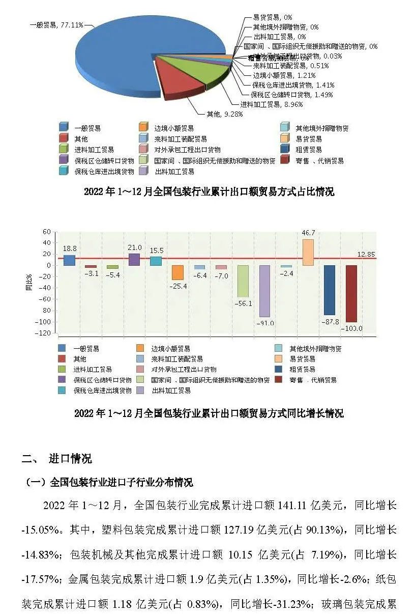 2月底,中國(guó)包裝聯(lián)合會(huì)發(fā)布了“2022年全國(guó)包裝行業(yè)進(jìn)出口概況”。根據(jù)報(bào)告顯示,2022年全國(guó)包裝行業(yè)完成累計(jì)進(jìn)出口總額693.63億美元,同比增長(zhǎng)5.78%。行業(yè)對(duì)外貿(mào)易保持較大順差。