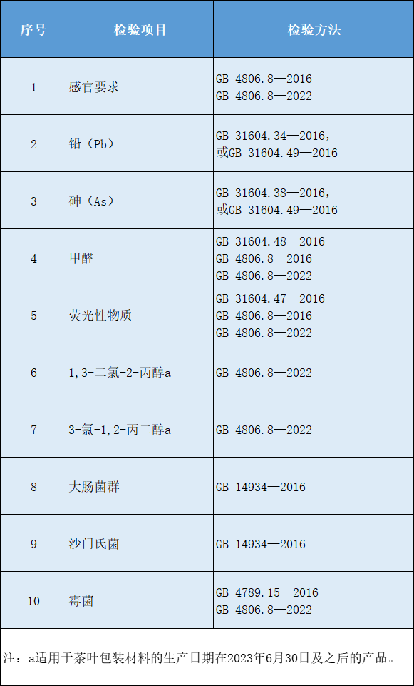 在檢驗(yàn)依據(jù)方面,《細(xì)則》對(duì)不同類別的茶葉包裝產(chǎn)品提出了具體的檢驗(yàn)項(xiàng)目和檢驗(yàn)依據(jù),具體涉及GB 4806.7-2016《食品安全國(guó)家標(biāo)準(zhǔn) 食品接觸用塑料材料及制品》、GB 4806.8-2016《食品安全國(guó)家標(biāo)準(zhǔn) 食品接觸用紙和紙板材料及制品》、GB 4806.8-2022《食品安全國(guó)家標(biāo)準(zhǔn) 食品接觸用紙和紙板材料及制品》、GB 4806.9-2016《食品安全國(guó)家標(biāo)準(zhǔn) 食品接觸用金屬材料及制品》以及GB 4806.10-2016《食品安全國(guó)家標(biāo)準(zhǔn) 食品接觸用涂料及涂層》等現(xiàn)行有效的企業(yè)標(biāo)準(zhǔn)、團(tuán)體標(biāo)準(zhǔn)、地方標(biāo)準(zhǔn)及產(chǎn)品明示質(zhì)量要求的相關(guān)條目。具體內(nèi)容如下: