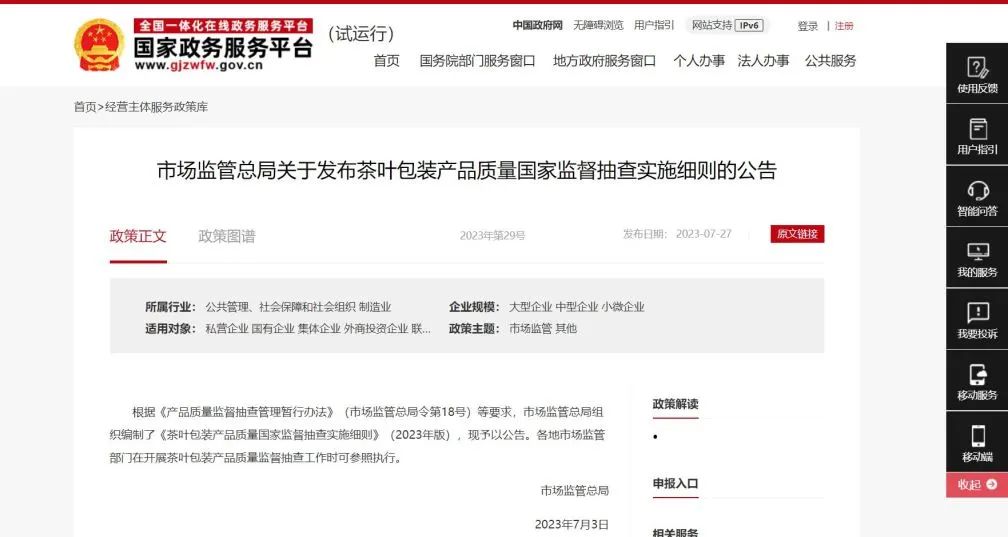 近日,市場(chǎng)監(jiān)管總局首次發(fā)布了《茶葉包裝產(chǎn)品質(zhì)量國(guó)家監(jiān)督抽查實(shí)施細(xì)則》(2023年版)(以下簡(jiǎn)稱《細(xì)則》),對(duì)茶葉包裝產(chǎn)品質(zhì)量的抽樣方法、檢驗(yàn)依據(jù)、判定規(guī)則、判定原則等作出了規(guī)定。